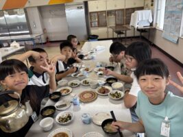 5年生大貫⑩ 仲町小の様子 2025.06.11 各部屋で片づけを進める中、食事係が集合して朝食お配膳を始めてくれました。昨日よりも手際よく、みんなと協力して取り組んでくれたのであっという間に配膳が完了しました。その後、150人そろって「いただきます」。挨拶の時やお話を聞くときの態度も格段に良くなっていて、ここでも子どもたちの成長を感じることができました。