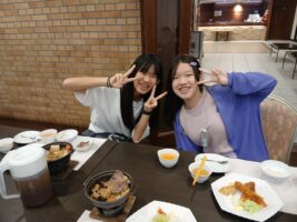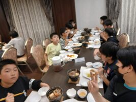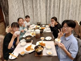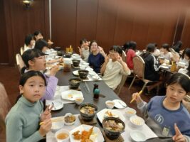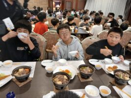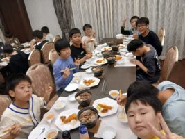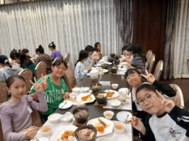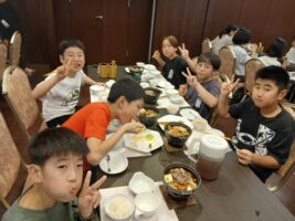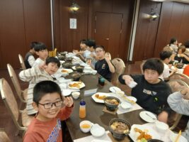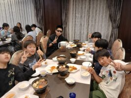 6年生修学旅行⑪ 仲町小の様子 2025.10.16 では、「いただきます」。子どもたちは美味しい顔をたくさん向けてくれながら、もりもり食べています。おかわりにもたくさんの人が並んで、たくさん食べました。6年生の保護者の皆様は、子どもたちが帰宅したら何が一番美味しかったか尋ねてみてください。ちなみに、例年の一番人気を、すき焼きとバニラアイスが競い合っています。