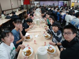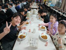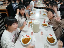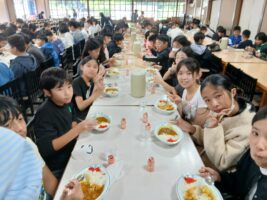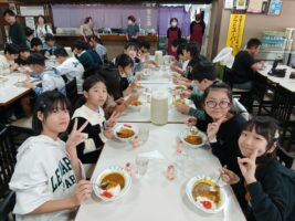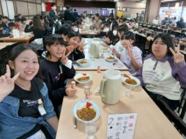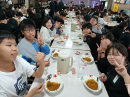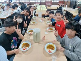 6年生修学旅行⑲ 仲町小の様子 2025.10.17 お土産を選び、いよいよ修学旅行最後にみんなで食べるお昼です。メニューは給食でも人気のカレーです。朝食をたくさん食べたのにお腹が空いたと、あっという間に食べ終わっていました。